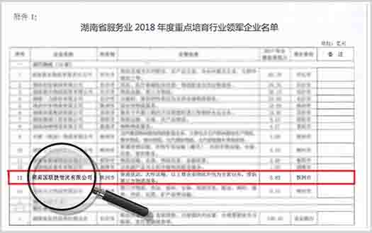 根据《湖南省服务业“双百”工程实施方案(试行)》(湘服联办[2017]2号)有关规定,依据2017年度服务业 “双百”工程重点企业和重点项目调度实施情况,按照“动态管理、质量优先、退补平衡”的原则,对纳入全省2018年度服务业“双百”工程企业和项目名单进行了适当调整。纳入2018年度全省服务业“双百”工程的重点企业共计104家,初步统计,2017年主营业务收入总计3155.6亿元;纳入2018年度全省服务业“双百”工程的重点项目共计101个,初步统计,总投资约5562.9亿元,2018年计划完成投资640.7亿元,涵盖了全省14个市州、12个服务业重点产业。湖南国联捷物流有限公司成为湖南省物流行业14家领军企业之一。