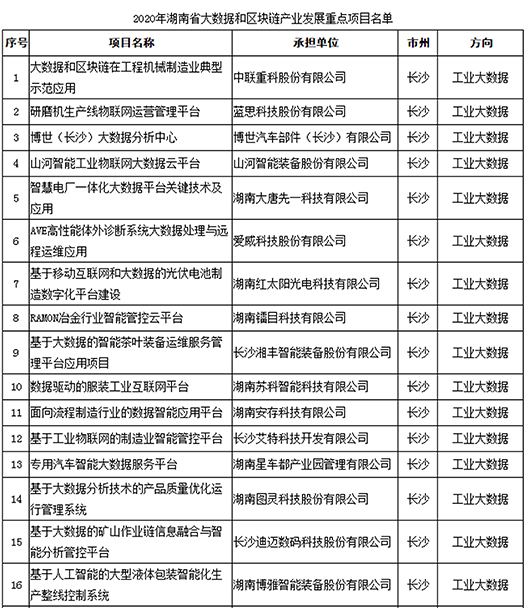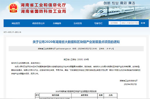 3月27日,湖南省工业和信息化厅发布了《关于公布2020年湖南省大数据和区块链产业发展重点项目的通知》,共有86个项目为2020年湖南省大数据和区块链产业发展重点项目,