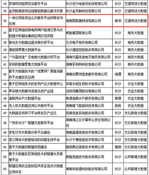 湖南物流公司国联捷物流的《一体化网络货运公共服务平台的研发与应用》项目位列第36。