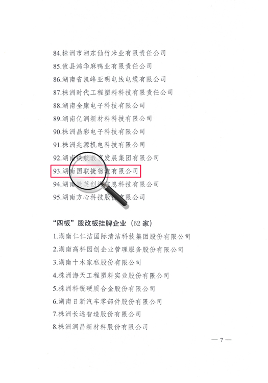 株洲市资本市场发展工作领导小组近日公布了“株洲市拟上市(挂牌)企业资源名单库”,将157家成长性好、发展潜力大的企业列为株洲市拟上市(挂牌)企业,湖南物流公司国联物流名列第93位(排名不分先后)。